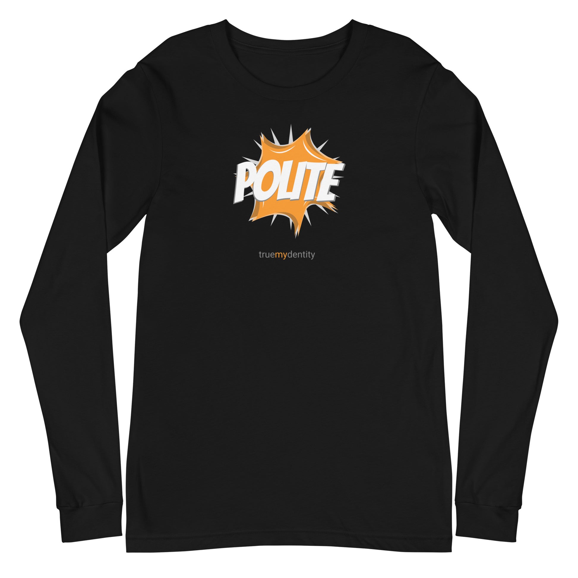 We print the polite action design on the front of Bella Canvas unisex long sleeve shirts. A comfortable, classic, 100% cotton feel that can be styled with athleisure or jeans for a casual look. Or worn with a blazer for a more classy, business casual look while remaining comfortable. A classic crew neck, versatile long sleeve shirt fit for any closet!